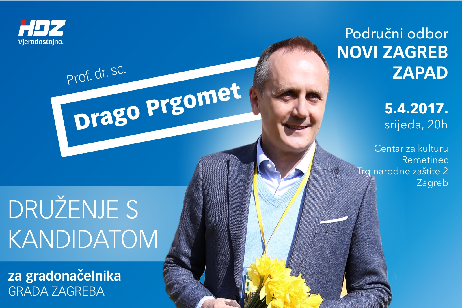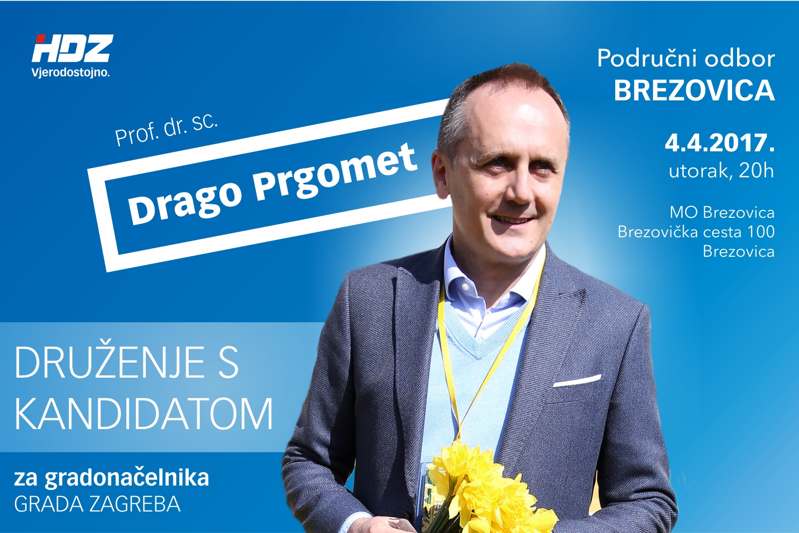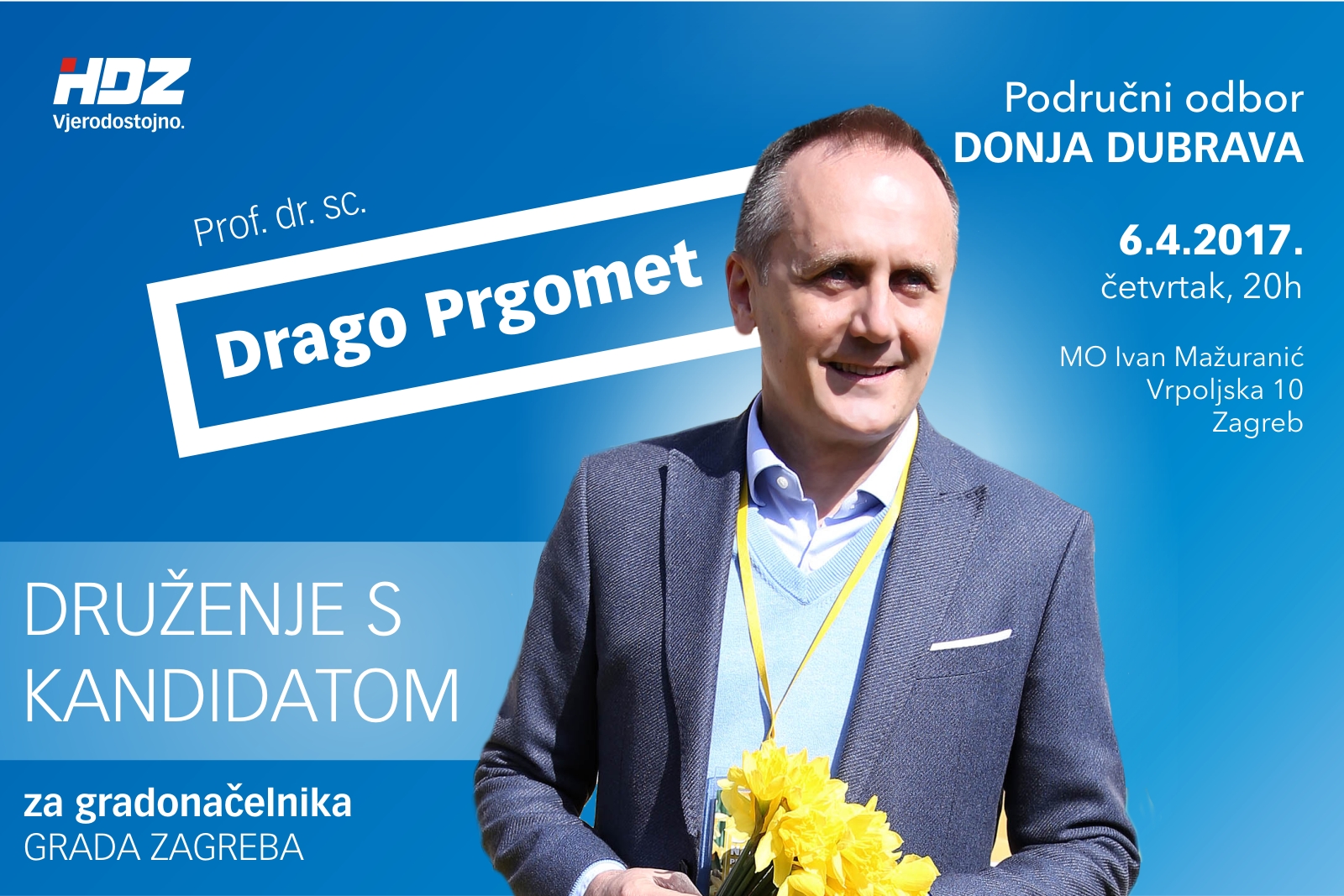 Dana 04. 04. 2017. u Mjesnoj samoupravi Sloboština, Vladimira Varićaka 11, s početkom u 18.00 sati održati će se druženje s kandidatom HDZ-a za gradonačelnika Grada Zagreba gospodinom dr. sc. Dragom Prgometom.