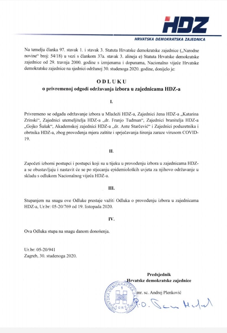 Privremeno se odgađa održavanje izbora u Mladeži HDZ-a, Zajednici žena HDZ-a "Katarina Zrinski", Zajednici utemeljitelja HDZ-a "dr. Franjo Tuđman", Zajednici branitelja HDZ-a "Gojko Šušak", Akademskoj zajednici HDZ-a "dr. Ante Starčević" i Zajednici poduzetnika i obrtnika HDZ-a, zbog provođenja mjera zaštite i sprječavanja širenja zaraze virusom COVID-19.
